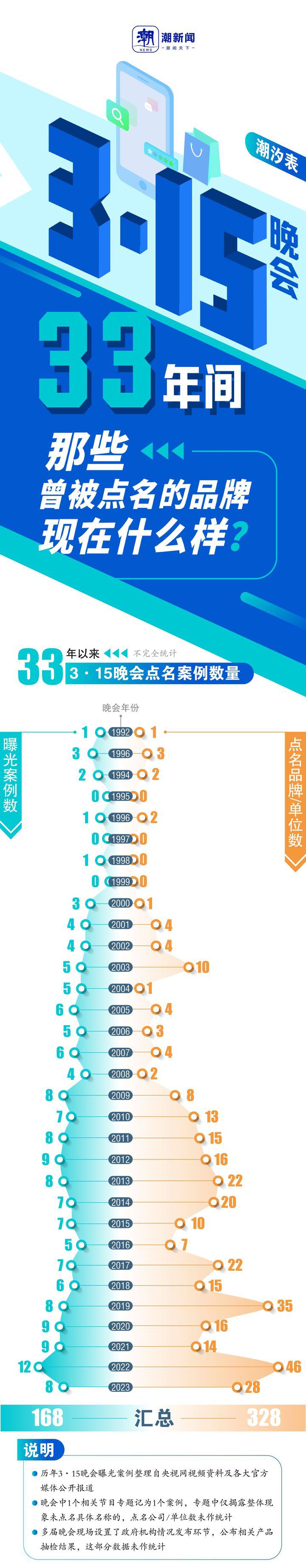 据不完全统计,328个被3·15晚会公开点名的品牌/单位中,过半数处于正常经营状态,66家被吊销或注销,43家“查无此牌”无法搜索到目前状态,16家停产或关闭,12家经营异常,还有7家已经改名换姓另起炉灶,另有3家被收购。