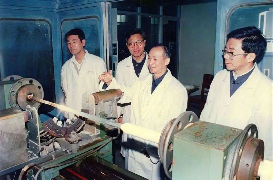 · 赵梓森(右二)早年在武汉邮科院研制光纤。