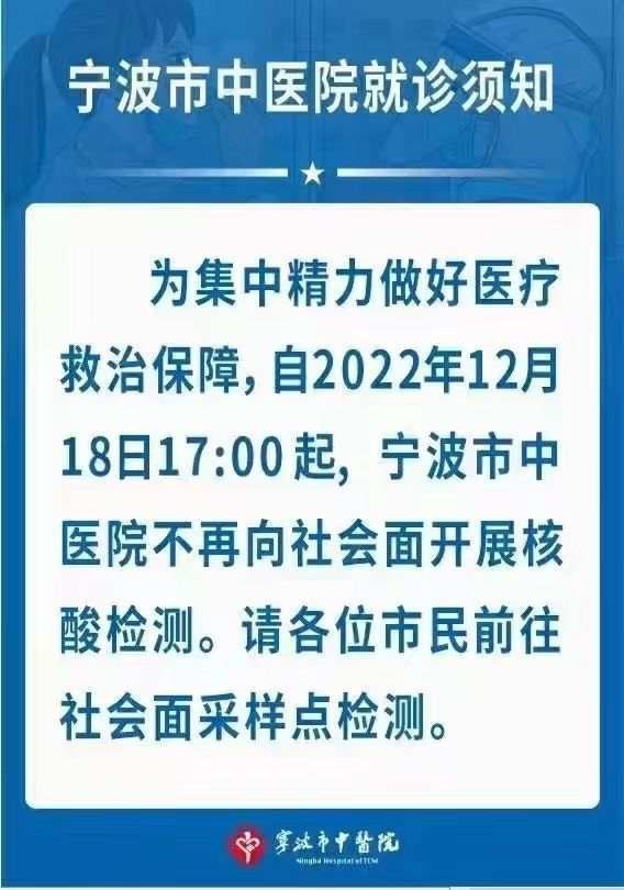 12月17日,宁波市妇女儿童医院、宁波市中医院发出核酸采样检测最新通知:不再开展社会面核酸采样。