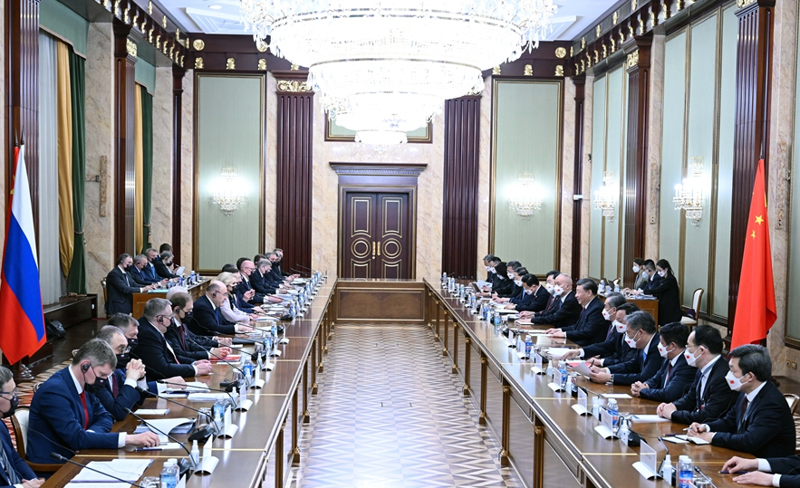 当地时间3月21日上午,国家主席习近平在俄罗斯联邦政府大厦会见俄罗斯总理米舒斯京。新华社记者 张领 摄