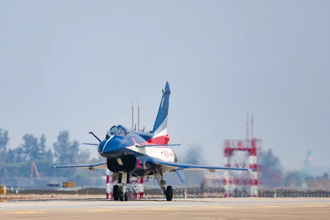 “cleared for takeoff(允许起飞)”,接到塔台起飞指令后,6架歼-10表演机在云底高600米的条件下,分2批快速滑跑起飞,伴随着巨大轰鸣声冲向天际,在空中完成集合编组后,随即飞往机场附近海面上空。