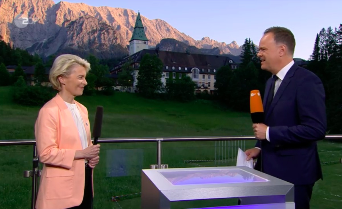 冯德莱恩(左)26日晚在出席七国集团峰会期间接受德国媒体采访(来源:视频截图)