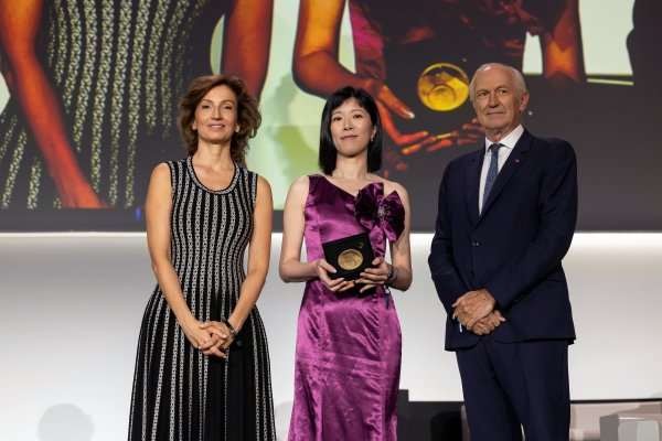 联合国教科文组织总干事奥德丽·阿祖莱(Audrey Azoulay)(左一)、欧莱雅董事会主席、欧莱雅企业基金会主席安巩(Jean-Paul Agon)(右一)为胡海岚(中间)颁发2022年“世界杰出女科学家成就奖”。