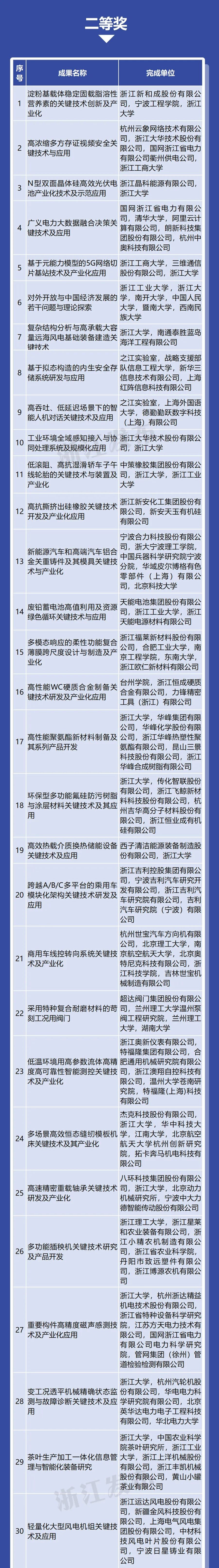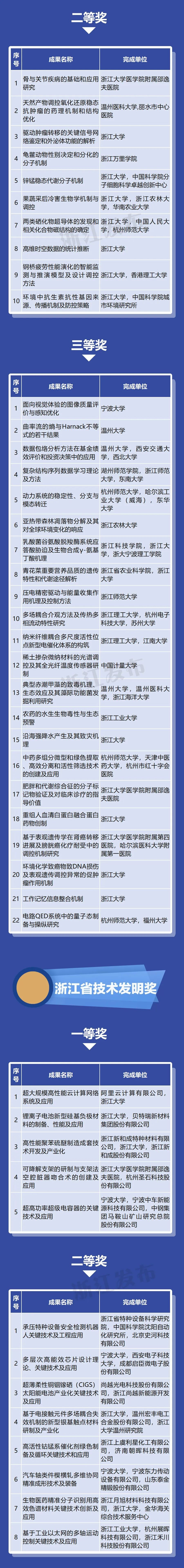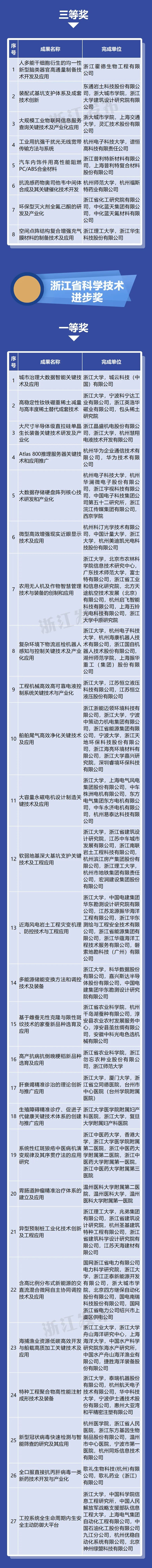 国家重大项目、重点科技计划担纲者等高层次人才领街完成的一等奖成果36项、占82%;所有完成人中,70、80后科技工作者占81%,青年科研人才成为浙江科研主力军。