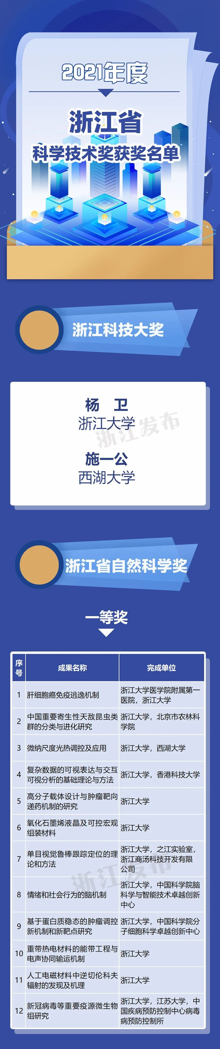 会上,颁发306项2021年度浙江省科学技术奖,其中浙江科技大奖2项,由杨卫院士、施一公院士获得;299项成果(项目)获省自然科学奖、技术发明奖和科学技术进步奖;国际科学技术合作奖5项。