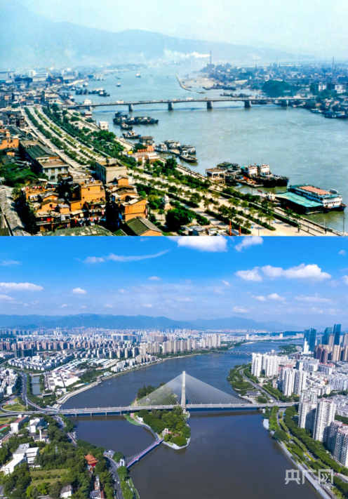 闽江两岸发展对比图。上图:上世纪80年代末的福州南北江滨(央广网发 杨婀娜 摄)下图:今日之福州闽江两岸,高楼林立,风景秀美(央广网发 陈捷阳 摄)