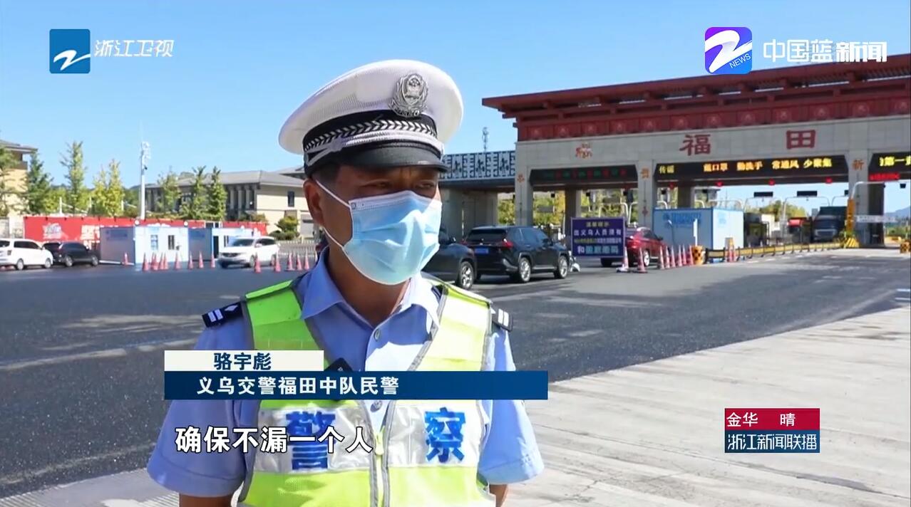 义乌交警福田中队民警骆宇彪说:“进来的时候我们要查核酸证明,第二每个车箱都要打开看过,确保不漏一个人。”