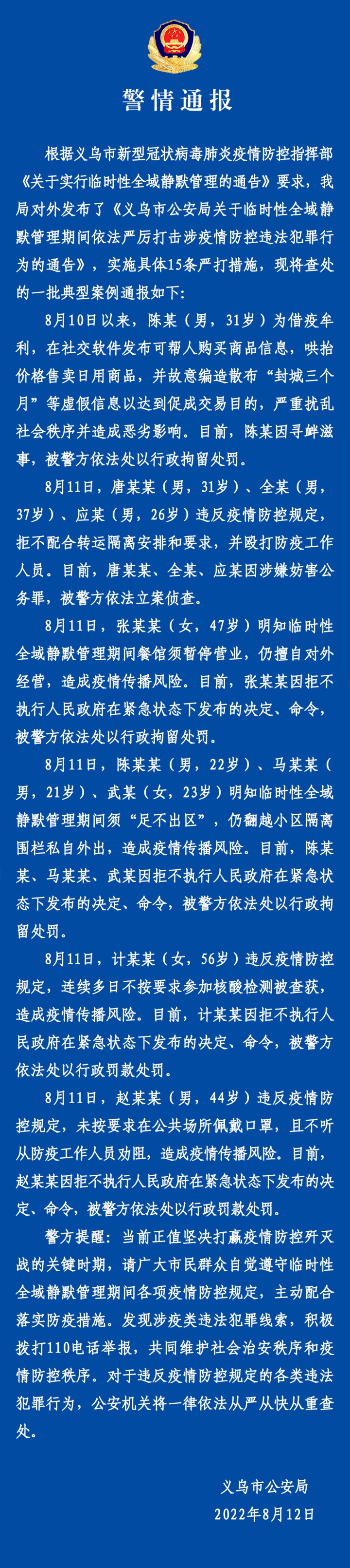 义乌公安警情通报:查处一批典型案例