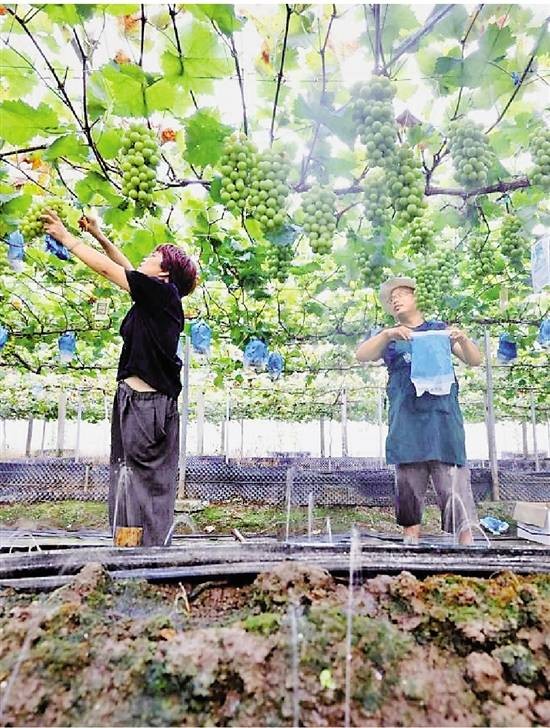 今夏,温岭津岭农科葡萄园的物联网水肥一体化灌溉系统有效保障了果园抗旱。图为8月10日,果农在葡萄园内劳作。浙江新闻客户端记者 朱海伟 拍友 徐伟杰 摄