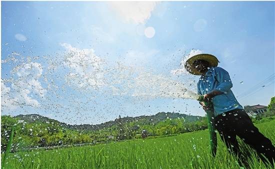 8月11日,工作人员在湖州市吴兴区一处水稻种植基地里灌水。近期,浙江多地高温天气持续,给农业生产带来不小的影响。新华社记者 徐昱 摄