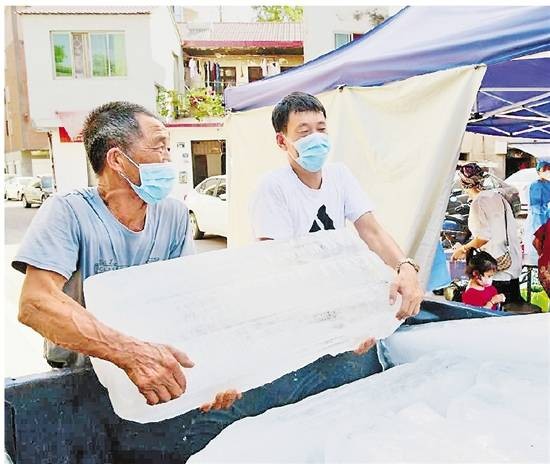 8月6日,金华经济技术开发区三江街道组织人员把降温用的冰块派发到核酸检测采样点。浙江新闻客户端拍友 时补法 本报记者 潘秋亚 摄