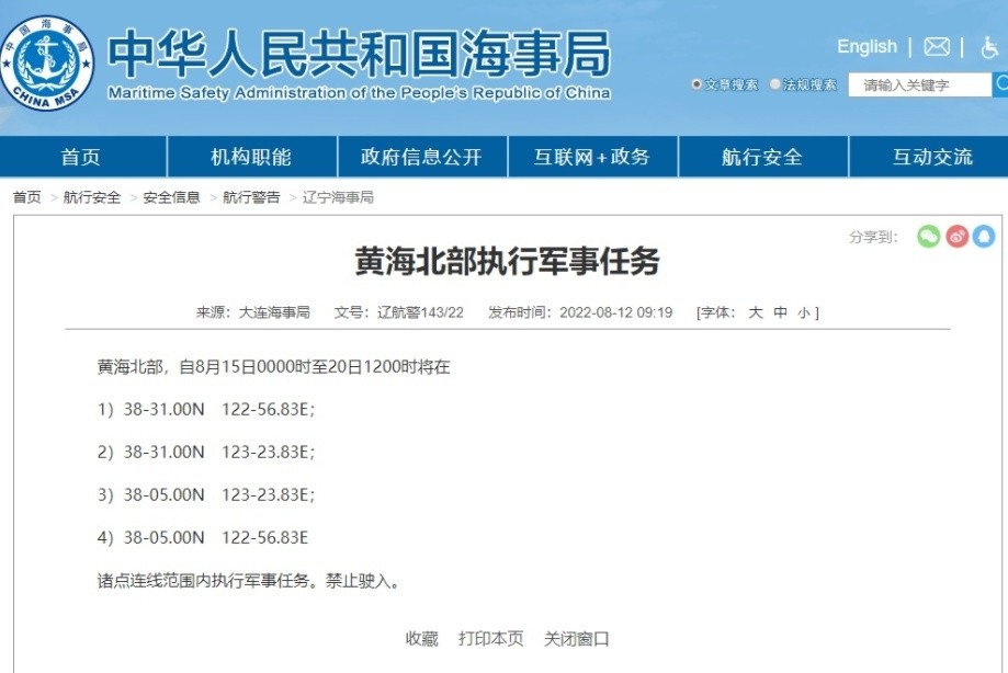 据大连海事局消息,黄海北部,自8月15日0000时至20日1200时将在