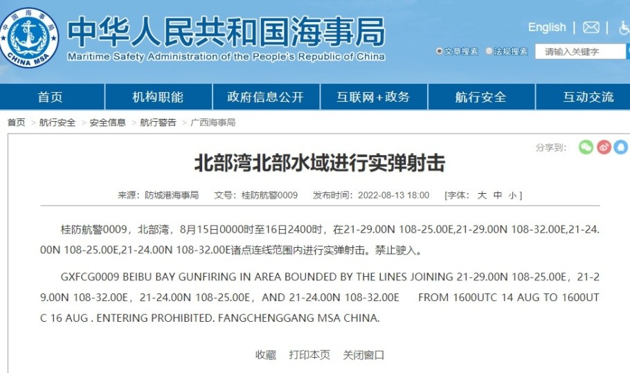 据防城港海事局消息,桂防航警0009,北部湾,8月15日0000时至16日2400时,在21-29.00N 108-25.00E,21-29.00N 108-32.00E,21-24.00N 108-25.00E,21-24.00N 108-32.00E诸点连线范围内进行实弹射击。禁止驶入。