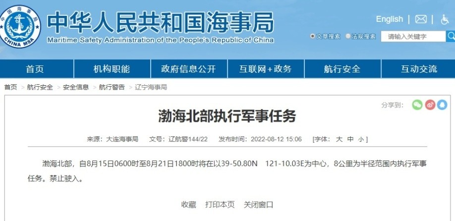 据大连海事局消息,渤海北部,自8月15日0600时至8月21日1800时将在以39-50.80N 121-10.03E为中心,8公里为半径范围内执行军事任务。禁止驶入。