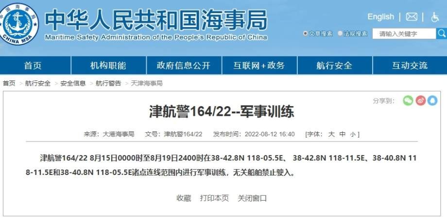 据大港海事局消息,津航警164/22 8月15日0000时至8月19日2400时在38-42.8N 118-05.5E、 38-42.8N 118-11.5E、38-40.8N 118-11.5E和38-40.8N 118-05.5E诸点连线范围内进行军事训练,无关船舶禁止驶入。
