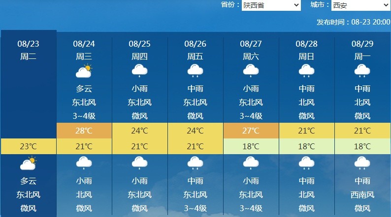 城市中,像是西安和郑州,23日两城市最高气温还有30℃出头,仍有夏日暖热;下周初就将降到20℃出头,累积降温近10℃,感觉上短短几天就从夏转换到了秋。