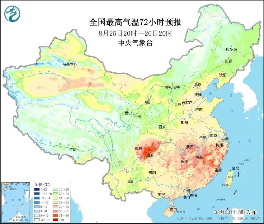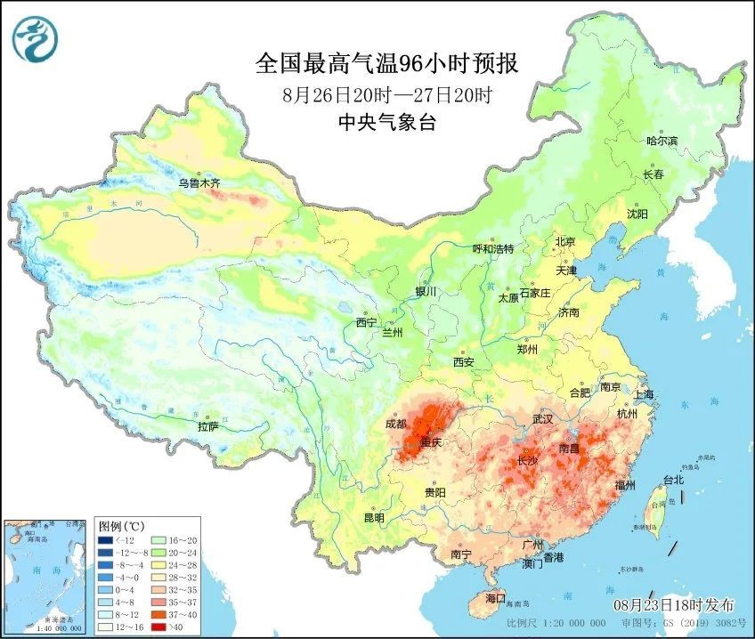 但是,与此形成强烈反差的是四川盆地、重庆、湖北东南部、湖南北部、江西大部、浙江、福建等地。23日14时,上述地区仍有大片40℃及以上的高温天气。14时全国气温排行榜上,四川、重庆、浙江均有站点上榜,上榜站点气温普遍在42℃以上。