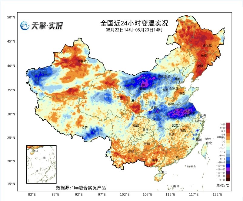 受冷空气影响,23日14时,陕西南部、河南、山东南部、湖北、安徽、江苏的气温与22日同时次相比都出现了不同程度温度的下降。尤其是在河南南部、安徽北部、江苏北部等地,降幅普遍在10℃或以上。