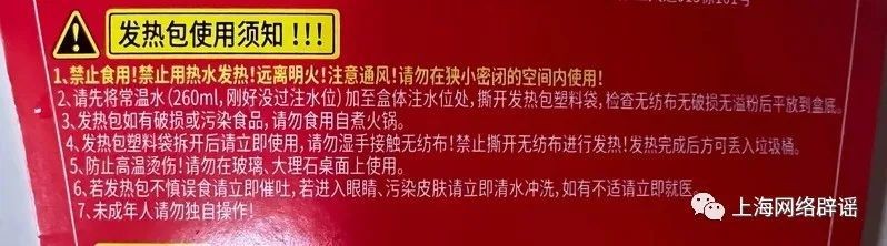 上海辟谣平台还注意到,也有网友认为,在“炸锅”事件中,当事人可能错按自热火锅的方式吃火锅了。因为自热火锅、米饭类产品的加热方式就是将冷水倒入发热包,将自热米饭、食材等放在上面即可。