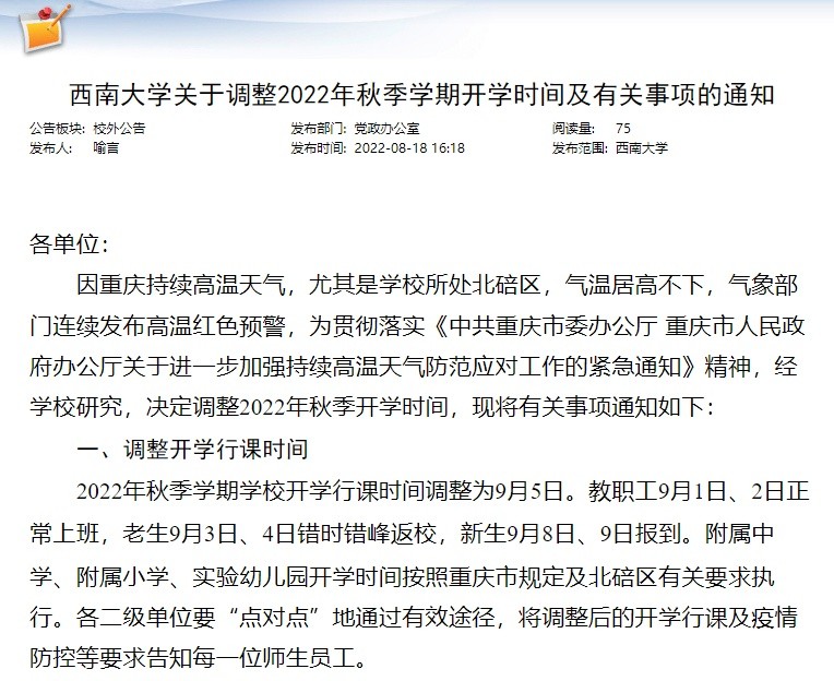 受持续高温影响,重庆多所高校调整开学时间,通知师生延期返校。