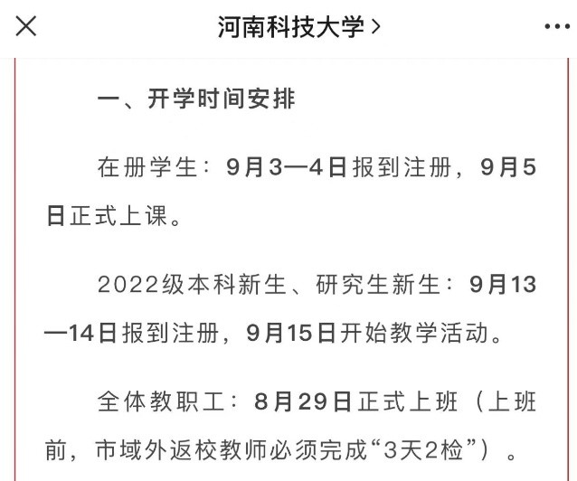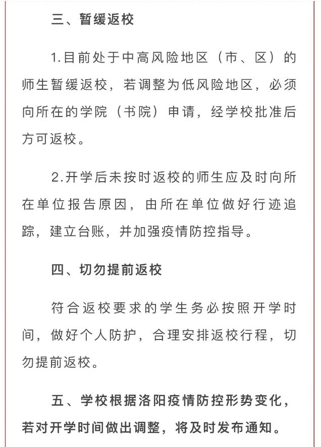 河南科技大学公布了最新开学时间,同时也明确部分学生暂不返校: