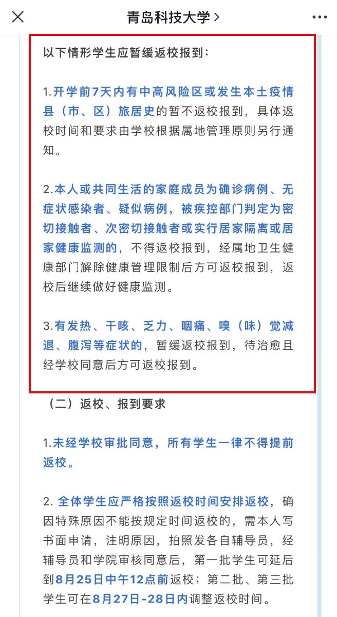 8月19日,记者梳理中国石油大学(华东)、青岛科技大学、青岛农业大学等驻青高校返校安排获悉,高校学子秋季学期继续实行分批错峰返校,未经学校审批同意一律不得提前返校。