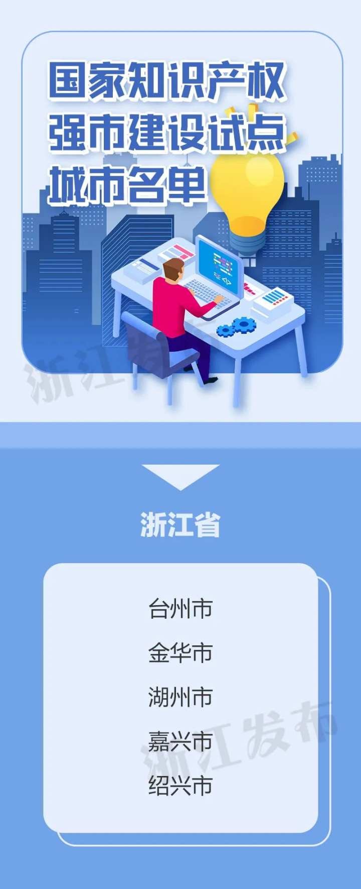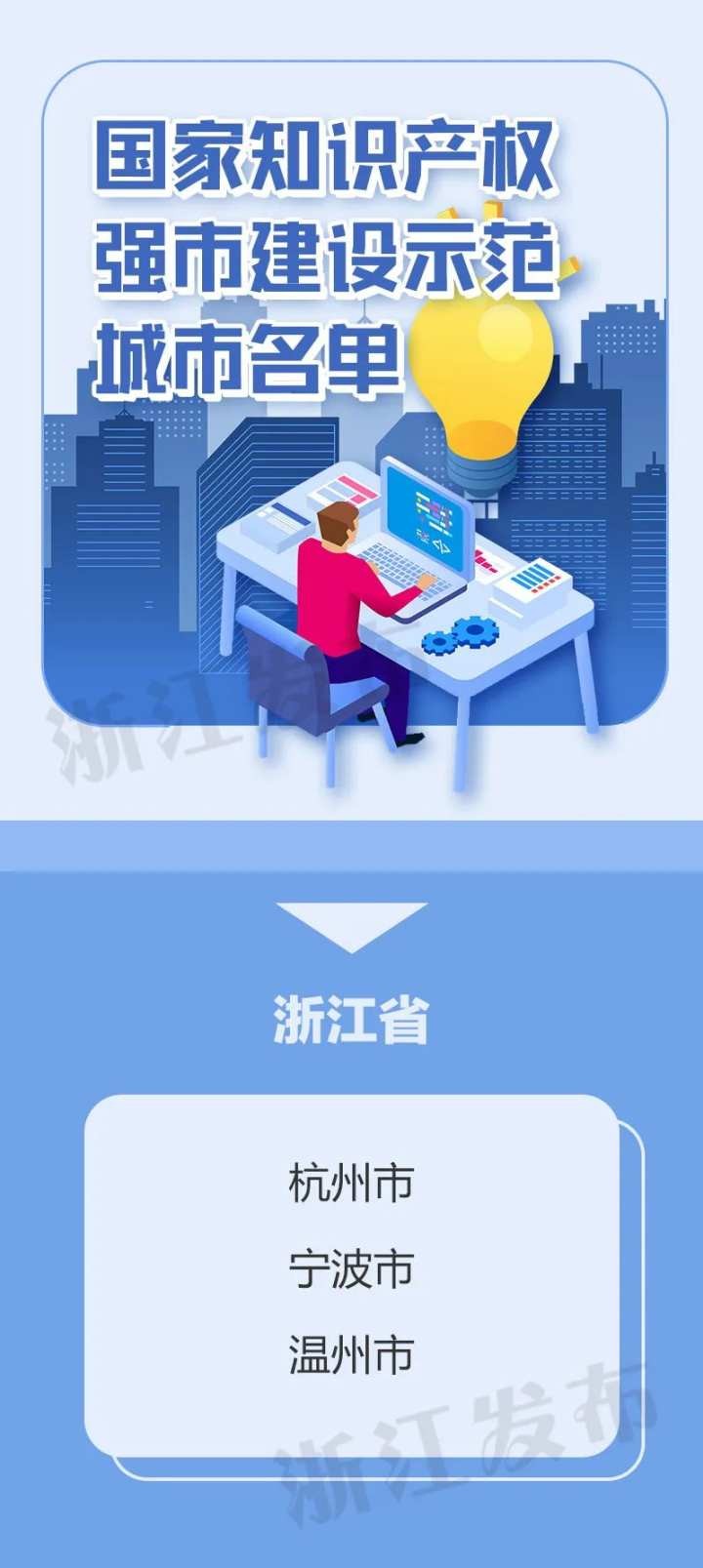 近日,国家知识产权局印发《关于确定国家知识产权强市建设试点示范城市的通知》。其中,浙江3地入选国家知识产权强市建设示范城市名单、5地入选试点城市名单。