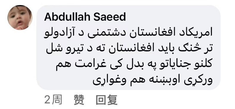 网民阿卜杜拉·萨伊德表示,美国除了应该归还阿富汗的资产,还应该为过去二十年的罪行向阿富汗赔偿、道歉。