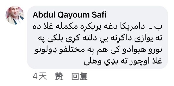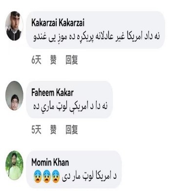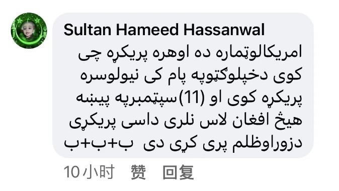 网民苏尔坦·哈米德·哈桑瓦尔留言表示,美国是掠夺者,其所做的每一个决定都是出于自身利益的考虑,阿富汗人民并没有参与“9·11”事件,美国却做出了霸权决定。