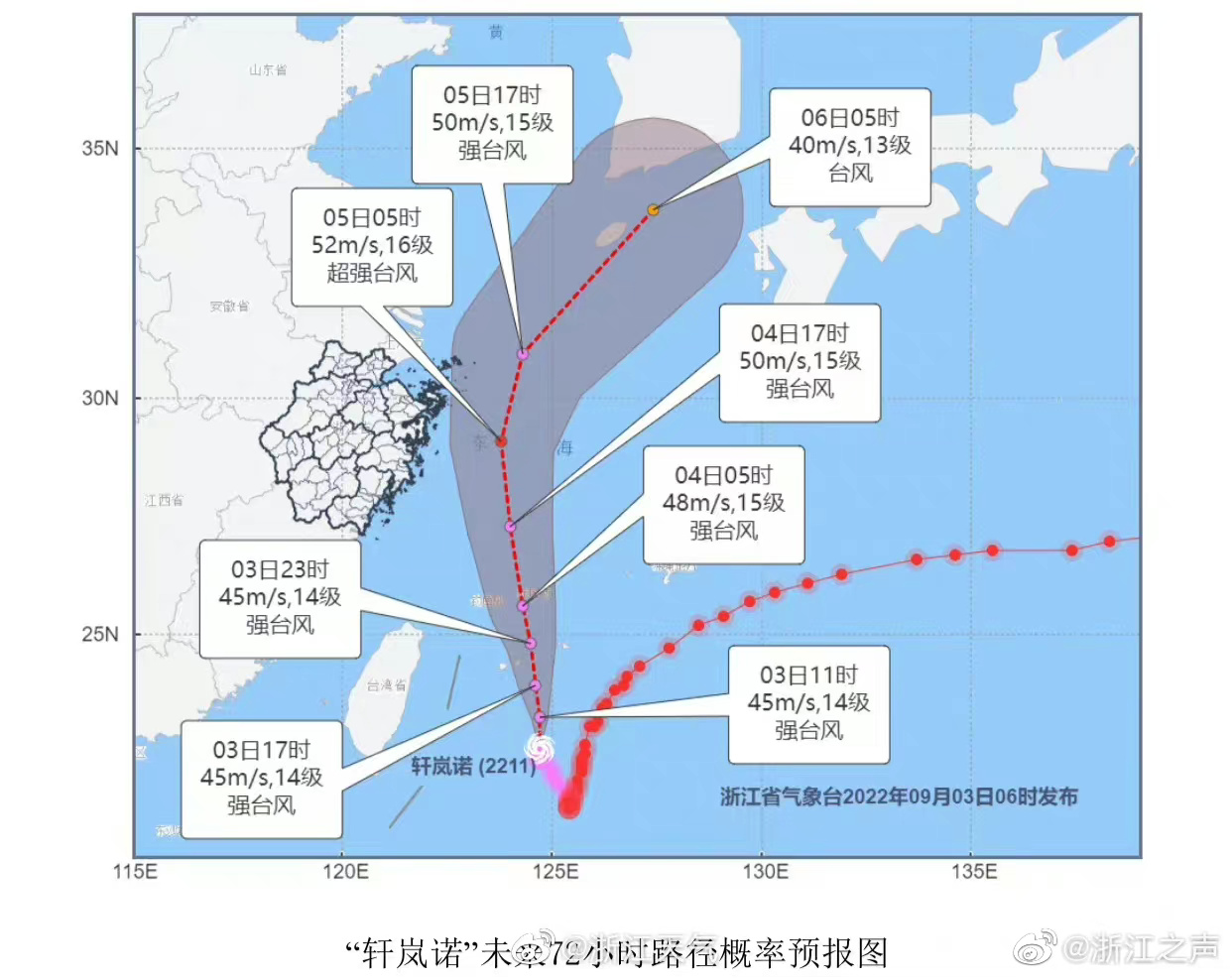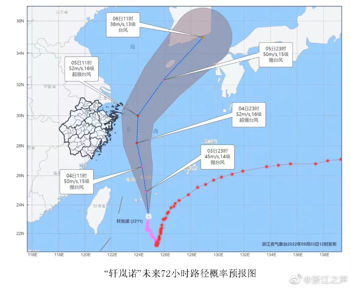 今年第11号台风“轩岚诺”(强台风级)3日21时中心位于浙江省朱家尖岛南偏东方向约650公里(宁波东南偏南方向约680公里)的洋面上,北纬24.5度、东经124.8度,近中心最大风力14级(45米/秒),中心最低气压950百帕,七级风圈半径300~420公里,十级风圈半径150~180公里,十二级风圈半径50公里,即将进入东海海面,并将以15公里左右时速向偏北方向移动,明天沿东经123~124度北上,有可能再次增强到超强台风级(16级),并逐渐向浙江东北部一带沿海靠近;后天中午前后越过宁波同纬度(北仑峙头以东150~200公里),之后转向东北方向,趋向朝鲜半岛南部到日本本州岛一带沿海。