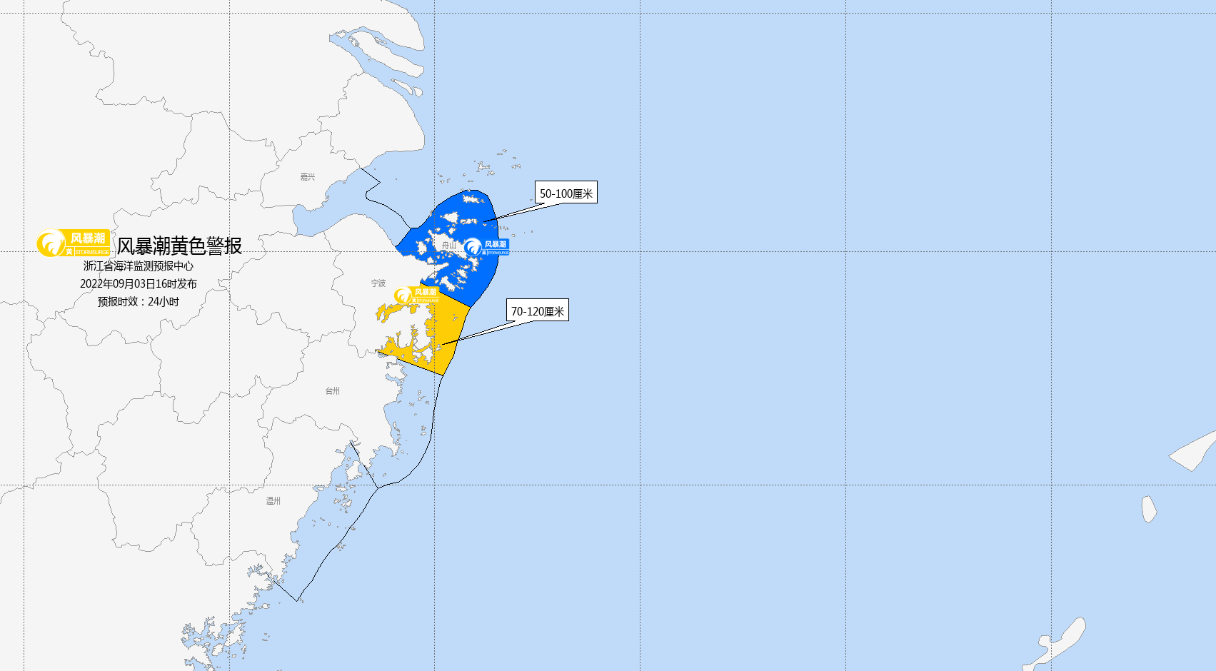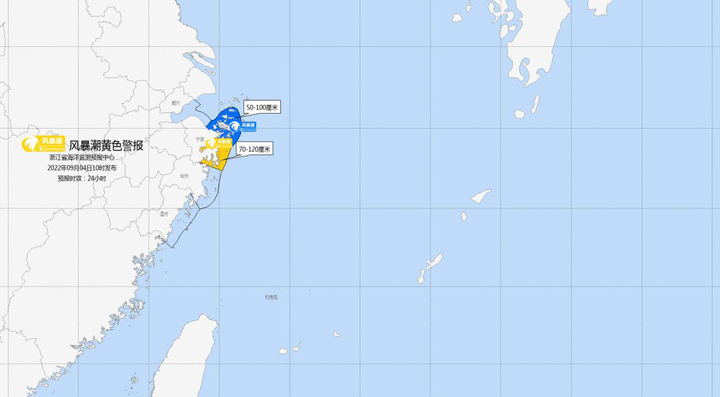 舟山沿岸将出现50-100厘米的风暴增水,宁波沿岸将出现70-120厘米的风暴增水。宁波市风暴潮预警级别为黄色;舟山市风暴潮预警级别为蓝色。
