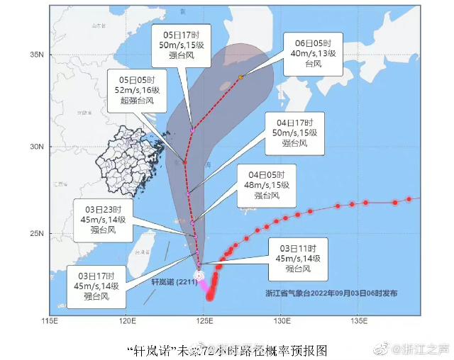 今天上午台风轩岚诺朝着东北方向走了45公里 宁波出现强降雨