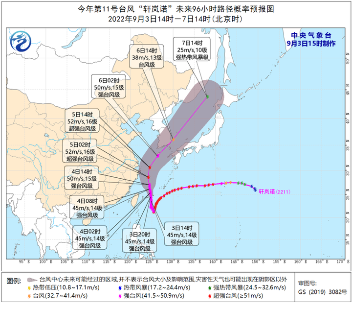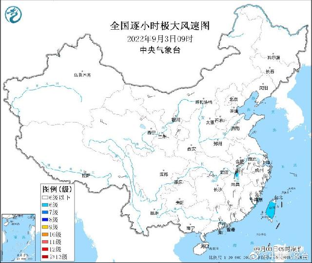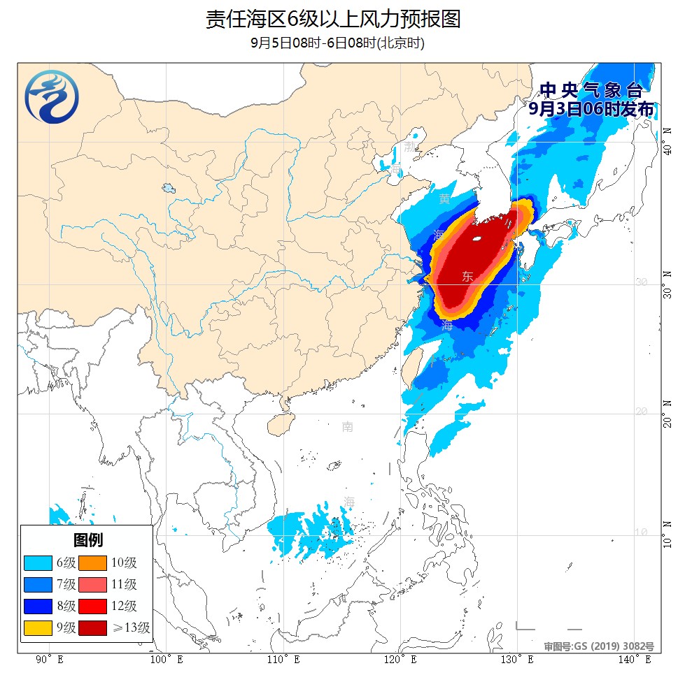 9月3日白天至5日夜间,受台风“轩岚诺”影响,台湾以东洋面、台湾海峡、巴士海峡、东海大部海域、黄海中部和南部海域将先后有6~8级、阵风9~10级的大风,其中台湾以东洋面、东海部分海域风力可达9~12级、阵风13~15级,台风中心经过的附近海域风力可达13~15级、阵风16~17级。有关台风“轩岚诺”的详细信息,请参见中央气象台最新一期《台风预警》。