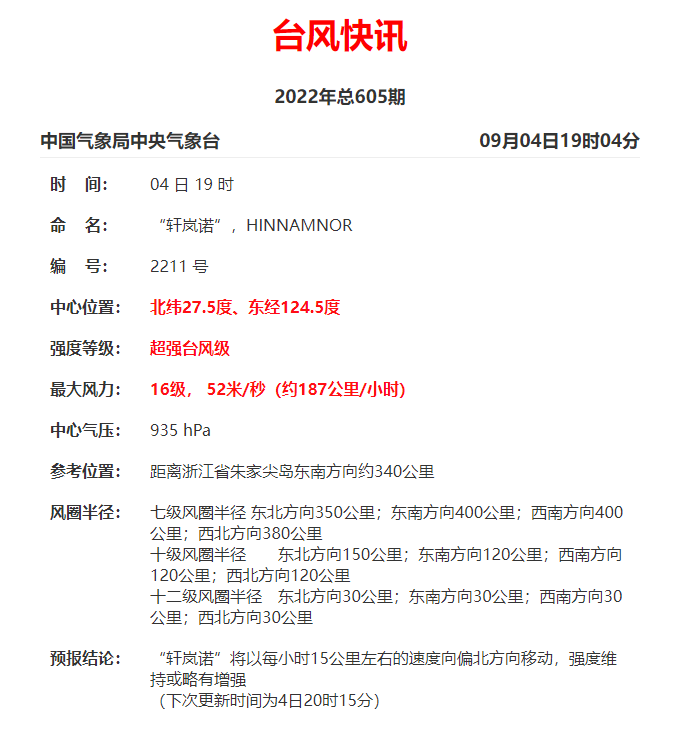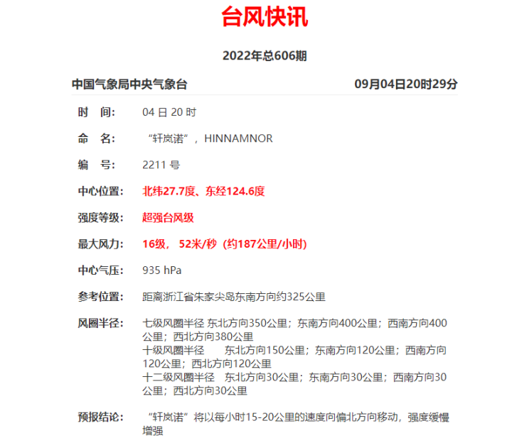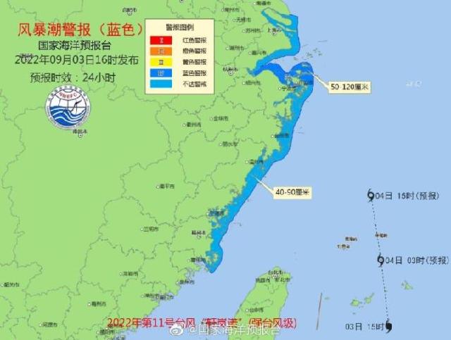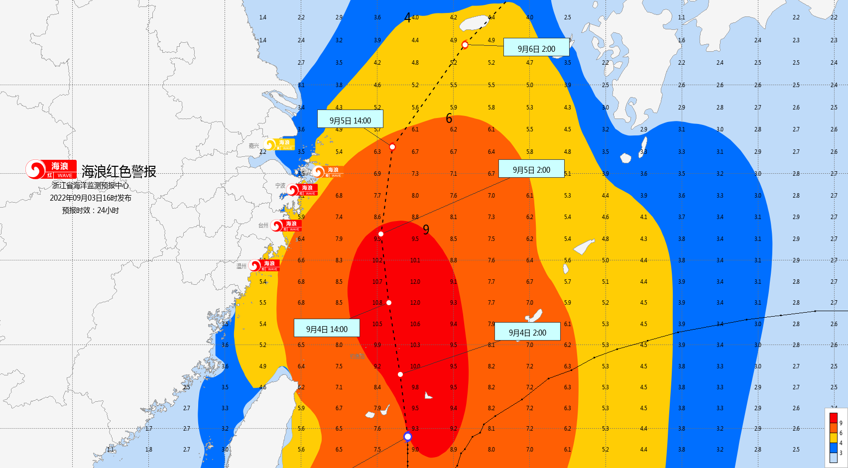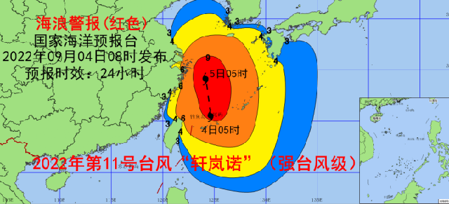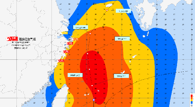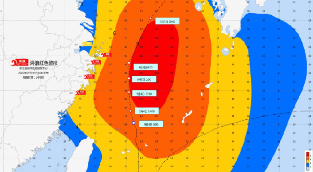 9月4日10时,浙江省海洋监测预报中心根据《海洋灾害应急预案》发布海浪红色警报、风暴潮黄色警报。