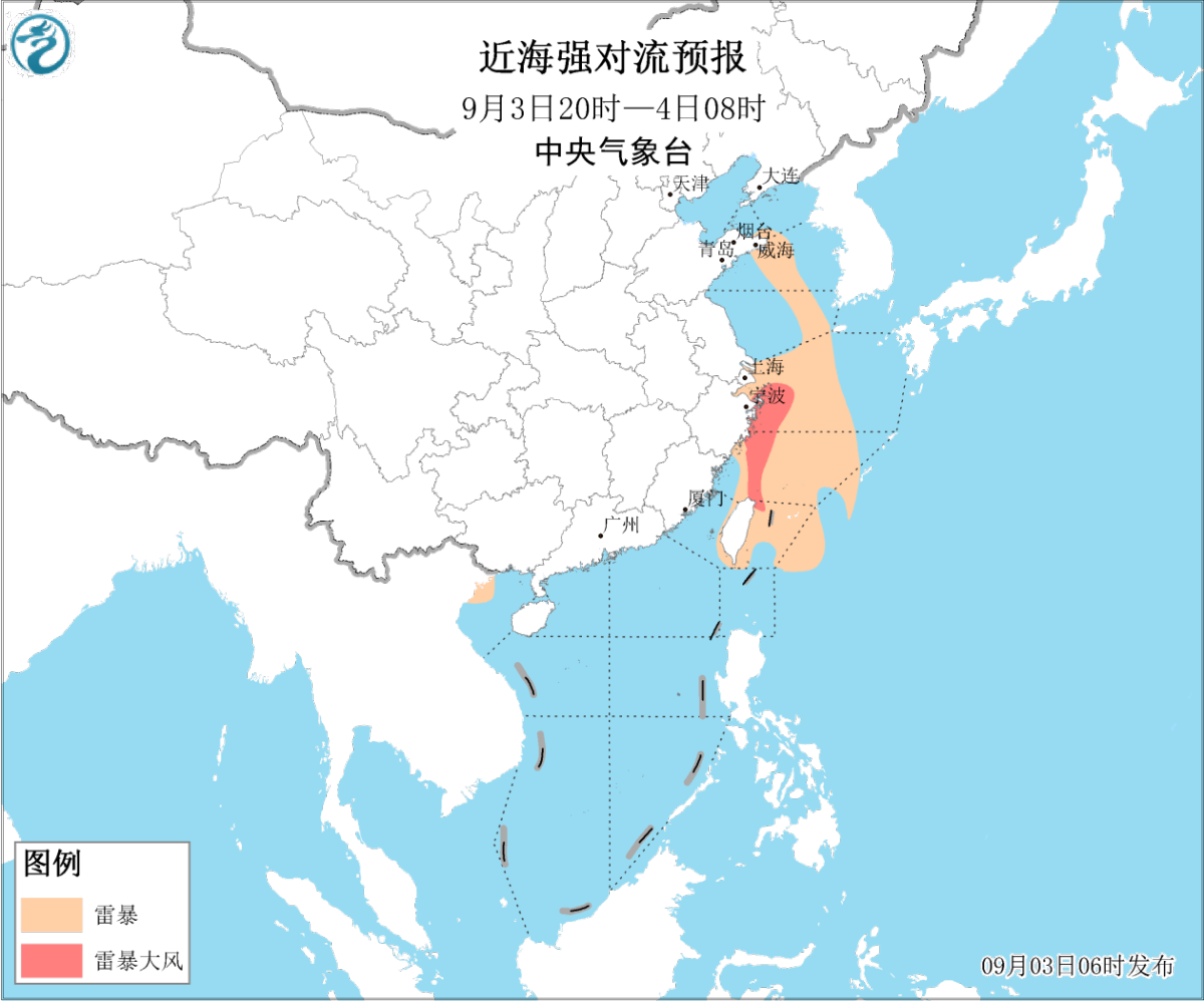 3日白天至夜间,浙江东部沿岸海域、台湾以东洋面、东海南部海域将有8~10级的雷暴大风。