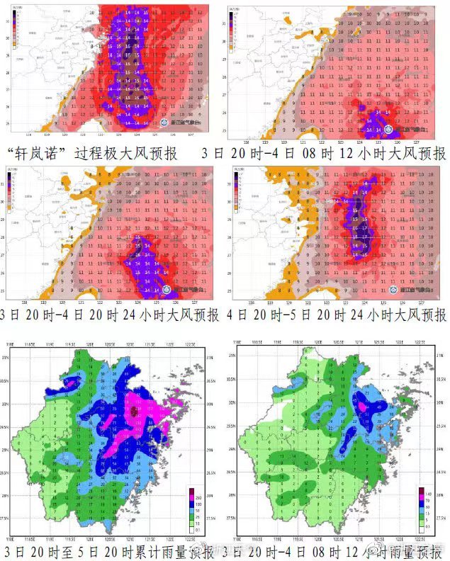 受台风轩岚诺影响,今天起东海海域由10~12级继续增强到14~16级,台风中心经过附近海域阵风可达17级或以上;今天浙中南沿海海面有9~10级阵风,今天夜里到5日沿海海面阵风自南而北增强到10~12级,其中浙北沿海海面部分13~15级。4-5日浙北沿海地区和杭州湾水面风力逐渐增强到10~12级,浙中南沿海地区阵风也有8~9级。另外,今天浙中北地区的东部有中到大雨局部暴雨,其中宁波、舟山地区局地有大暴雨;4-5日我省东部地区有中到大雨,其中宁波、舟山、嘉兴、绍兴、台州、金华东部等地部分有暴雨,局部大暴雨。