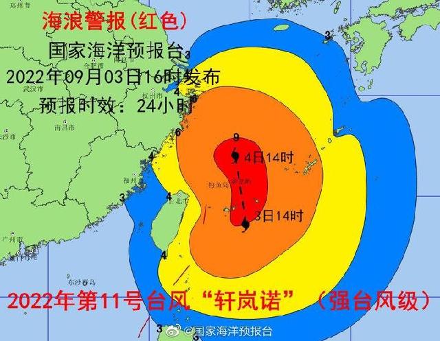 今年第11号台风“轩岚诺”(强台风级)已进入我国东海东南部海面,并逐渐向浙江近海靠近,受其影响,东海的浪高将持续增大,上海、浙江近岸海域将出现巨浪到狂狼,国家海洋预报台今天(4日)早上继续发布海浪红色警报和风暴潮蓝色警报。