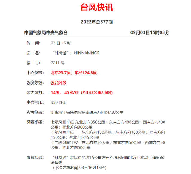 今年第11号台风“轩岚诺”(强台风级)的中心今天(9月3日)早晨5点钟位于浙江省舟山市朱家尖岛南偏东方向大约860公里的台湾以东洋面上,就是北纬22.5度、东经124.7度,中心附近最大风力有14级(42米/秒),中心最低气压为955百帕,七级风圈半径300-400公里,十级风圈半径120-180公里,十二级风圈半径50公里。