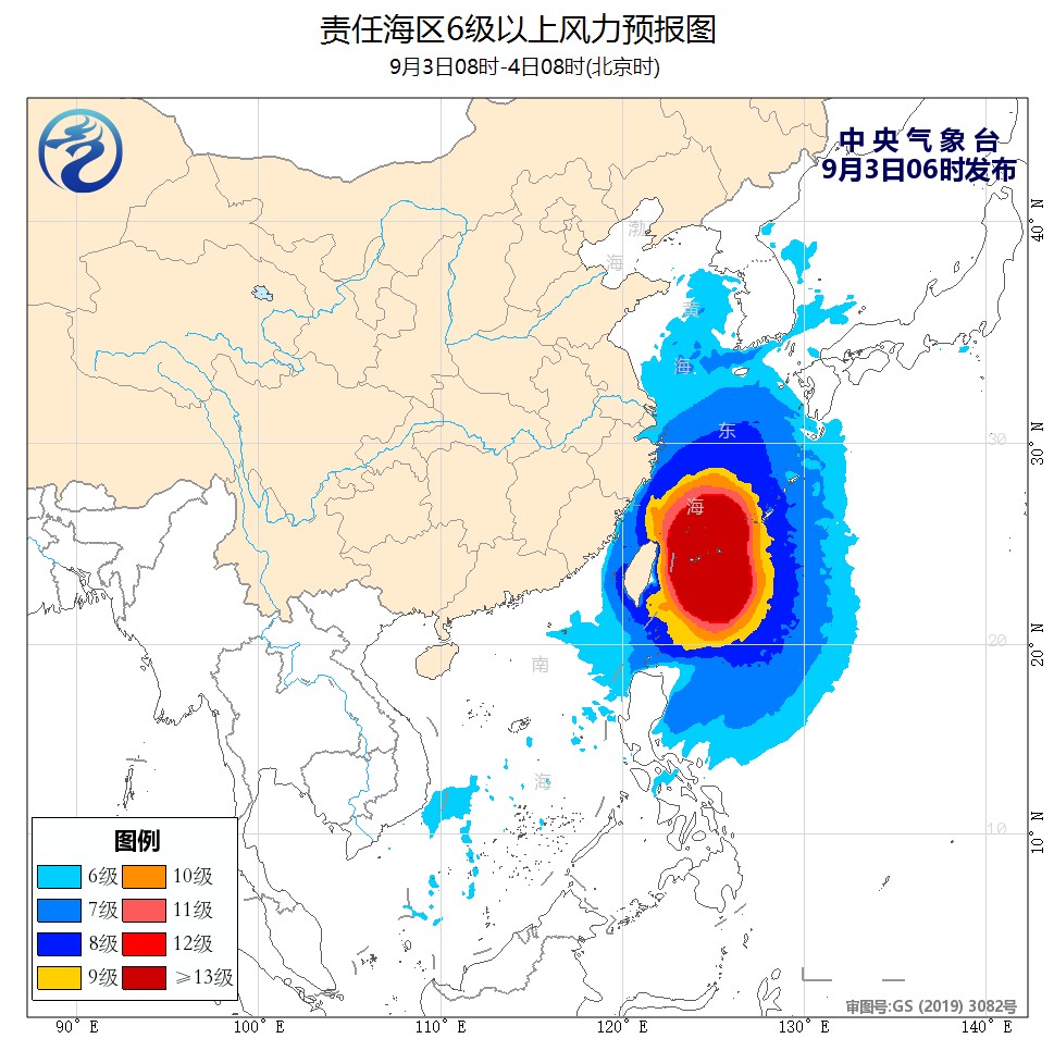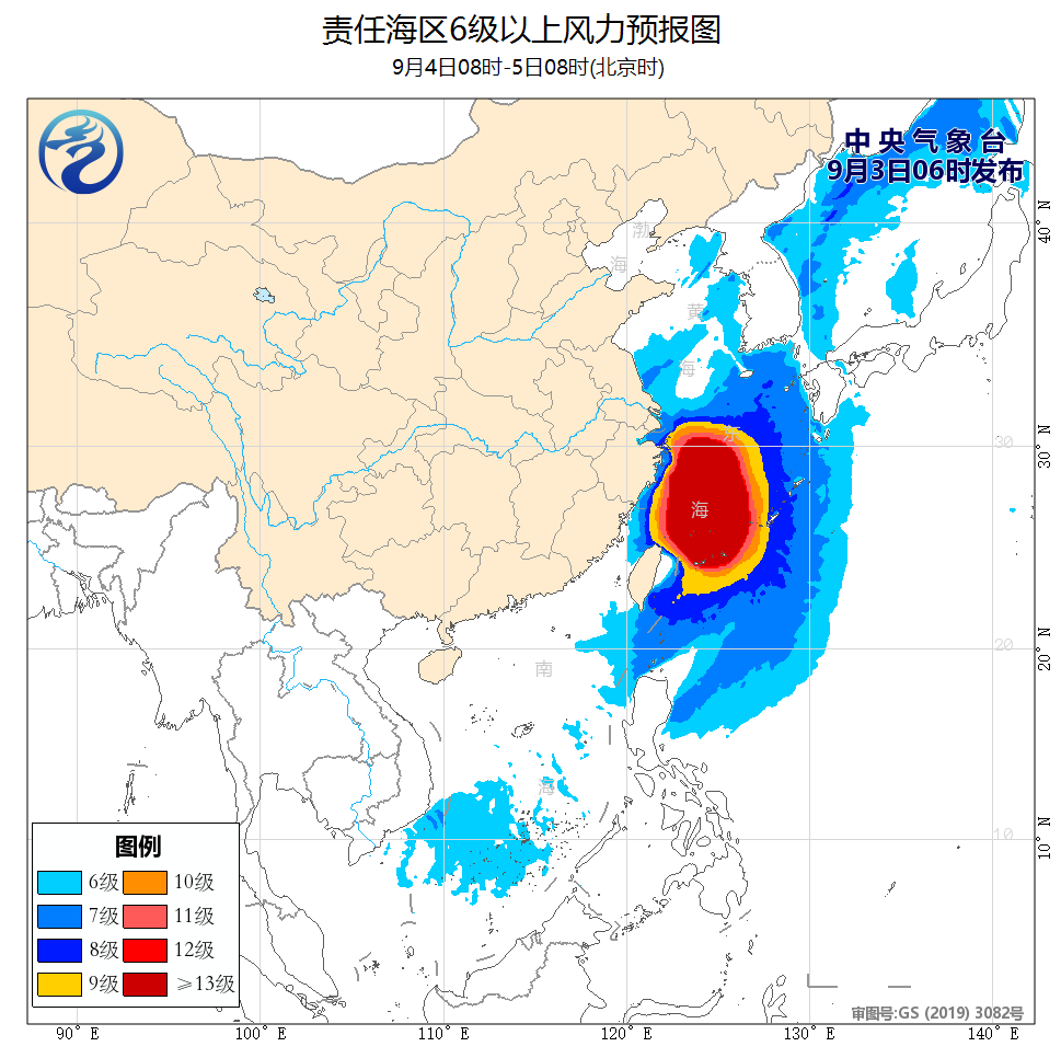 预计9月3日夜间至4日白天,东海南部、台湾以东洋面将出现8到12米的狂浪到狂涛区,近海海域海浪预警级别为橙色;浙江近岸海域将出现4到6米的巨浪到狂浪,该近岸海域海浪预警级别为红色,上海近岸海域将出现3.5到5.5米的大浪到巨浪,该近岸海域海浪预警级别为橙色,福建近岸海域将出现2.5到4米的大浪到巨浪,该近岸海域海浪预警级别为黄色,江苏南部近岸海域将出现2到3米的中浪到大浪,该近岸海域海浪预警级别为蓝色。