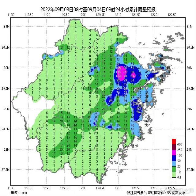 降水预报:9月3日08时至4日08时,浙江东北部、台湾岛等地将有大到暴雨,其中台湾岛北部的部分地区将有大暴雨,局地特大暴雨(250-350毫米)。