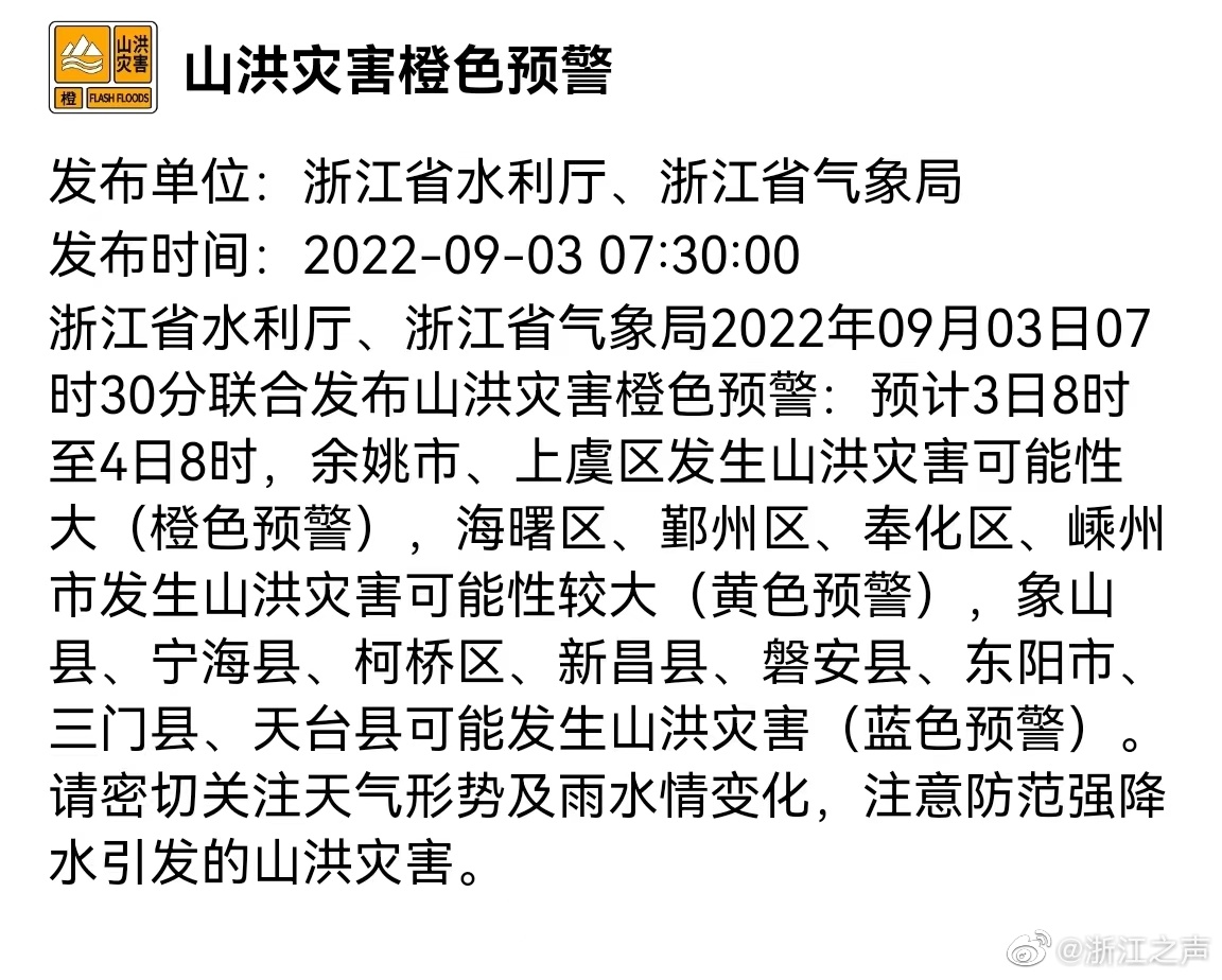 浙江省水利厅、浙江省气象局2022年09月03日07时30分联合发布山洪灾害橙色预警:预计3日8时至4日8时,余姚市、上虞区发生山洪灾害可能性大(橙色预警),海曙区、鄞州区、奉化区、嵊州市发生山洪灾害可能性较大(黄色预警),象山县、宁海县、柯桥区、新昌县、磐安县、东阳市、三门县、天台县可能发生山洪灾害(蓝色预警)。请密切关注天气形势及雨水情变化,注意防范强降水引发的山洪灾害。