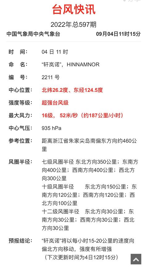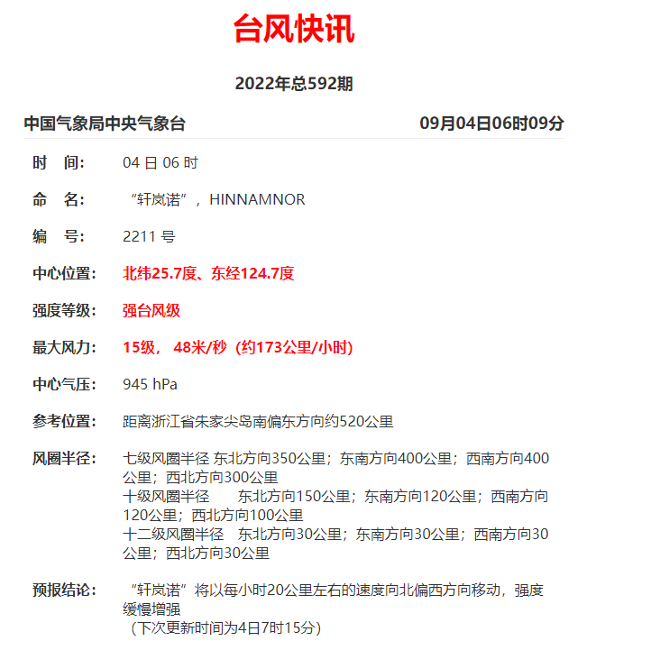 今年第11号台风“轩岚诺”(强台风级)的中心今天(9月4日)早晨5点钟位于浙江省舟山市朱家尖岛南偏东方向大约540公里的东海东南部海面上,就是北纬25.5度、东经124.7度,中心附近最大风力有15级(48米/秒),中心最低气压为945百帕,七级风圈半径300-400公里,十级风圈半径100-150公里,十二级风圈半径30公里。