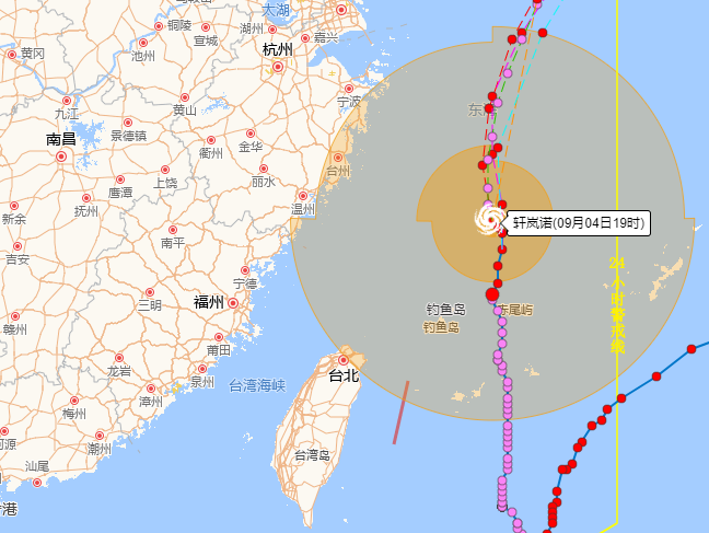 大风预报:9月3日08时至4日08时,巴士海峡、台湾海峡、台湾以东洋面、黄海南部、东海大部及钓鱼岛附近海域、长江口区、杭州湾,以及台湾岛北部和东部沿海、福建中北部沿海、浙江沿海、上海沿海、江苏南部沿海将有6-8级大风,阵风9-10级,其中台湾以东洋面的风力有9-12级,阵风11-15级,“轩岚诺”中心经过的附近海面的风力有13-15级,阵风可达16-17级。