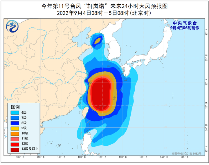 9月4日08时至5日08时,巴士海峡、台湾海峡、台湾以东洋面、黄海大部、东海、长江口区、杭州湾、台湾岛及其沿海、福建中北部沿海、浙江东北部、上海、江苏东部及沿海、山东半岛沿海将有6-9级大风,阵风10-11级,其中东海大部、台湾以东洋面、钓鱼岛附近海面、杭州湾、浙江东北部沿海的风力有10-12级,阵风11-13级,“轩岚诺”中心经过的附近海面的风力有13-16级,阵风可达17级及以上。