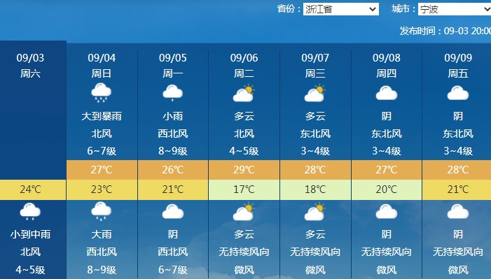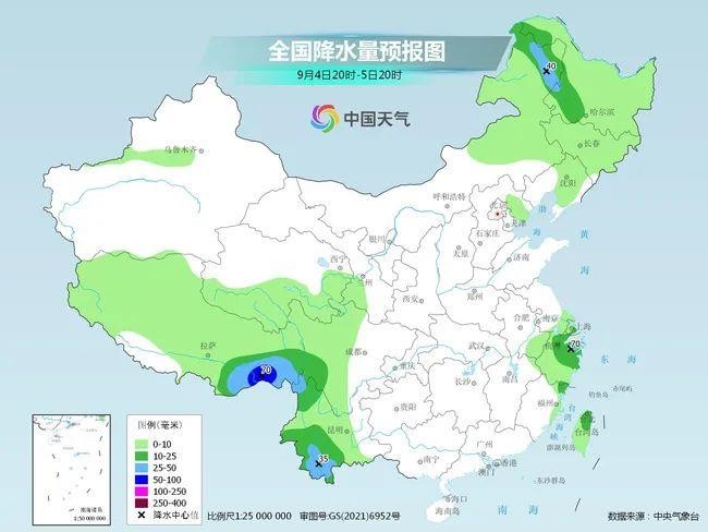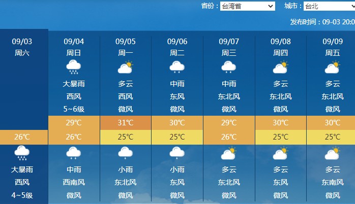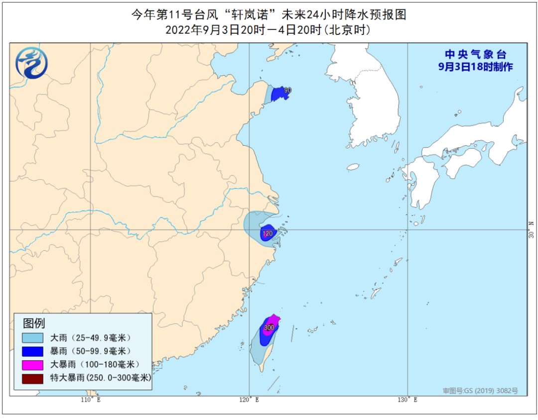 降水预报:9月3日20时至4日20时,山东半岛东部、上海南部、浙江东北部、台湾岛等地有大到暴雨,其中,浙江东北部和台湾岛中北部的部分地区有大暴雨(100—120毫米),台湾岛北部局地特大暴雨(250—300毫米)。