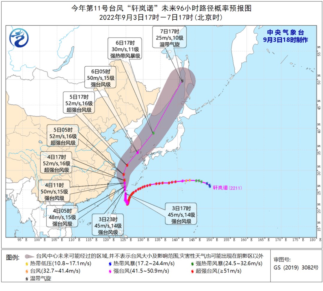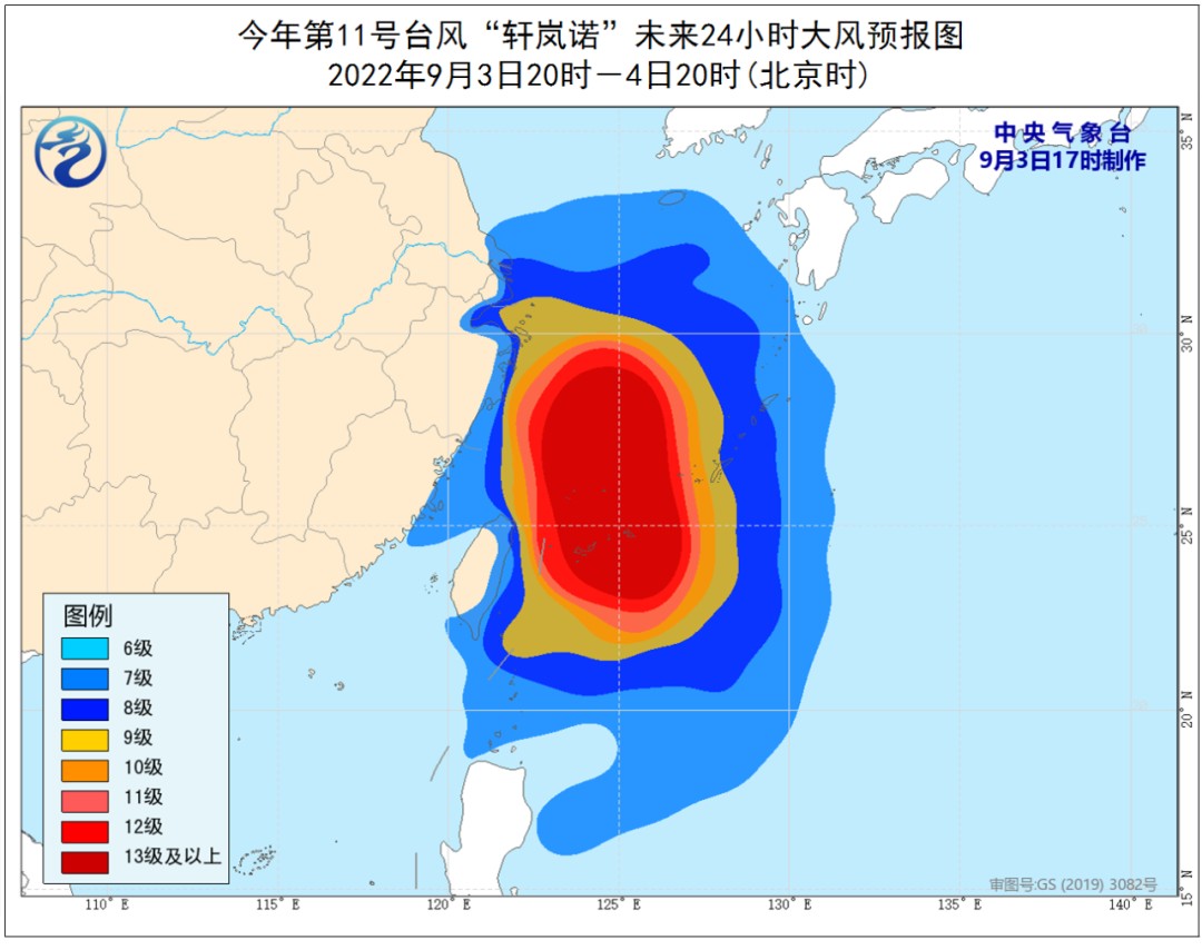 大风预报:9月3日20时至4日20时,巴士海峡、台湾海峡、台湾以东洋面、黄海南部、东海大部及钓鱼岛附近海域、长江口区、杭州湾、台湾岛及其沿海、福建中北部沿海、浙江东北部、上海、江苏东南部将有7—8级大风,阵风9—10级,其中台湾以东洋面、东海中南部、杭州湾、浙江东北部沿海的风力有9—12级,阵风10—13级,“轩岚诺”中心经过的附近海面的风力有13—16级,阵风可达17级及以上。另外受台风倒槽和弱冷空气的共同影响,黄海中北部及山东半岛东部也将有7—8级大风,阵风可达9—10级。