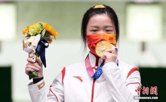 东京奥运会女子10米气步枪决赛中,中国选手杨倩夺得冠军,为中国代表团揽入本届奥运会第一枚金牌。这也是本届东京奥运会诞生的首枚金牌。图为杨倩隔着口罩亲吻金牌。中新社记者 杜洋 摄
