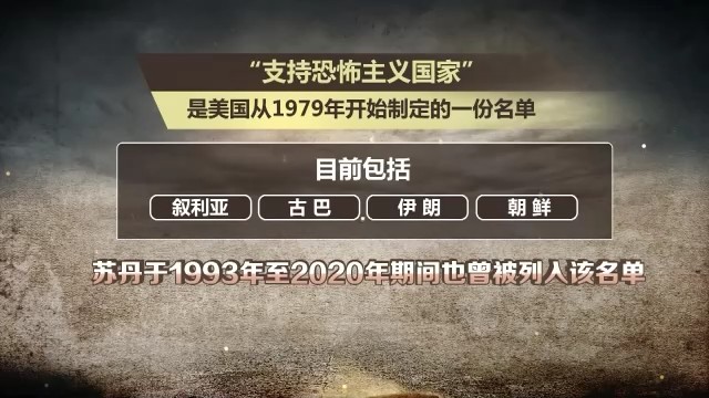 所谓的“支持恐怖主义国家”是美国从1979年开始制定的一份名单,最初包括叙利亚、利比亚、伊拉克和南也门(注:1990年与北也门合并为也门),目前包括叙利亚、古巴、伊朗和朝鲜。此外,苏丹于1993年至2020年期间也曾被列入该名单。