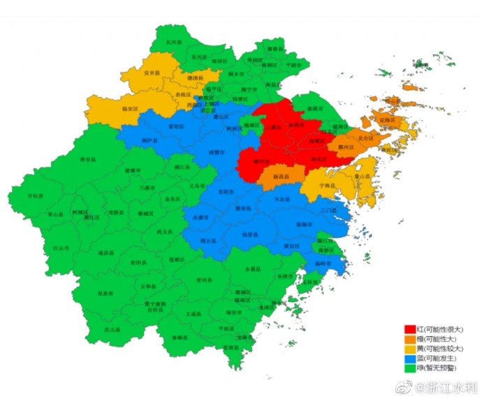 浙江省水利厅、浙江省气象局2022年9月13日7时35分联合发布山洪灾害红色预警。预计9月13日8 时至14日8 时,海曙区、奉化区、余姚市、上虞区、嵊州市发生山洪灾害可能性很大(红色预警),北仑区、鄞州区、新昌县、定海区、岱山县发生山洪灾害可能性大(橙色预警),余杭区、临安区、象山县、宁海县、德清县、安吉县、普陀区发生山洪灾害可能性较大(黄色预警),西湖区、萧山区、富阳区、桐庐县、柯桥区、诸暨市、磐安县、东阳市、永康市、黄岩区、三门县、天台县、仙居县、温岭市、临海市、缙云县可能发生山洪灾害(蓝色预警)。请密切关注天气形势及雨水情变化,注意防范强降水引发的山洪灾害。