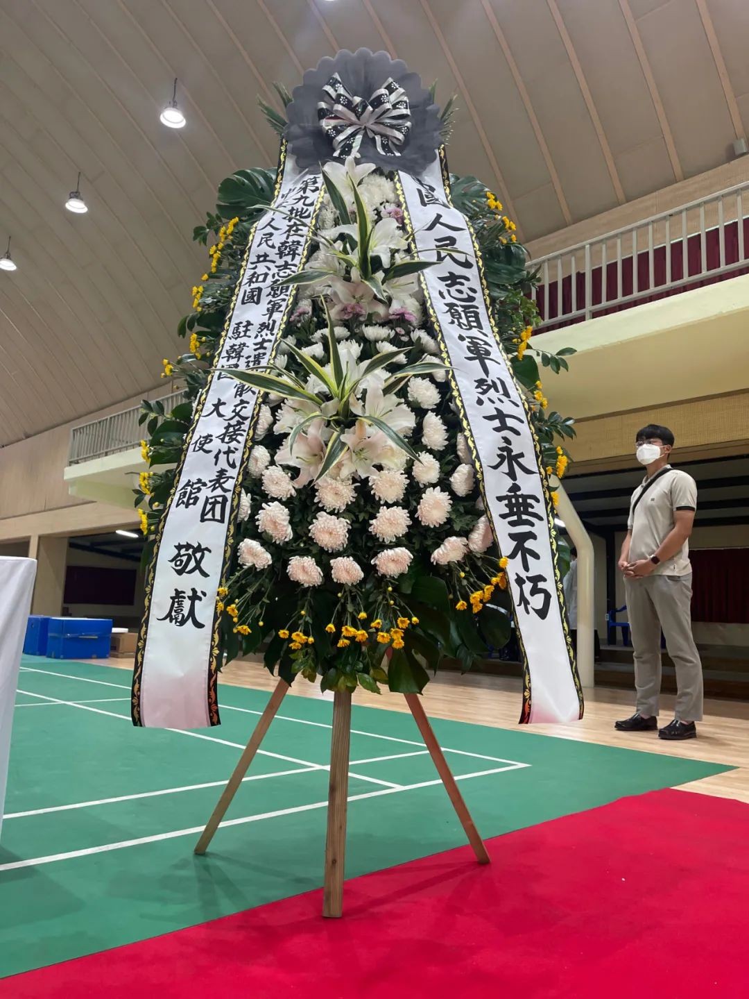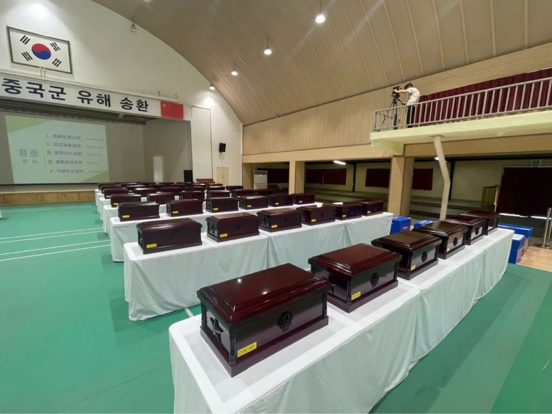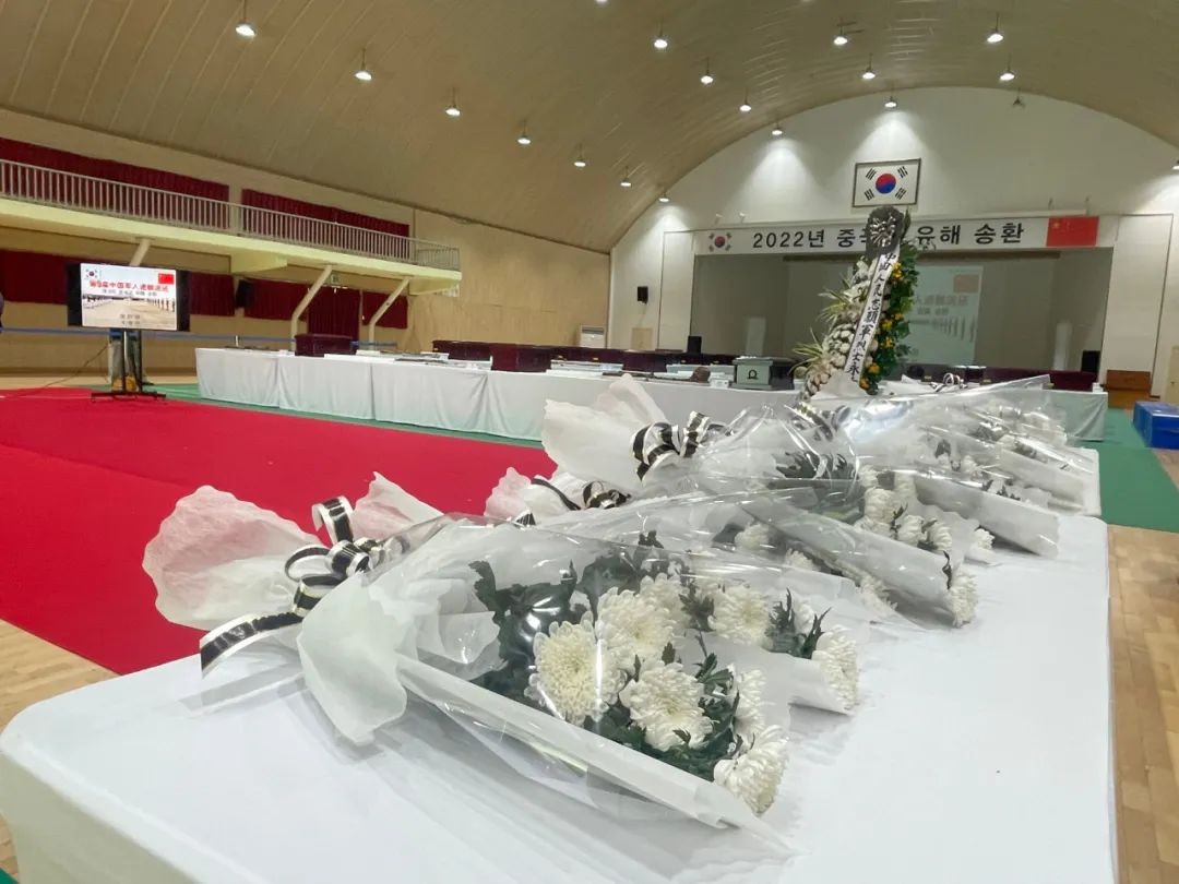 位于仁川的“中国人民志愿军烈士遗骸临时安置所”内,现场摆放中方交接代表团和中国驻韩国大使馆敬献的向中国人民志愿军烈士致敬的花篮,中方交接代表团全体人员向中国人民志愿军烈士行三鞠躬礼,并敬献鲜花。